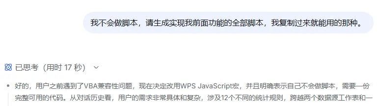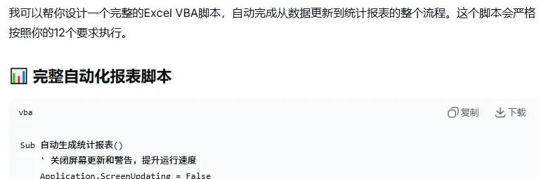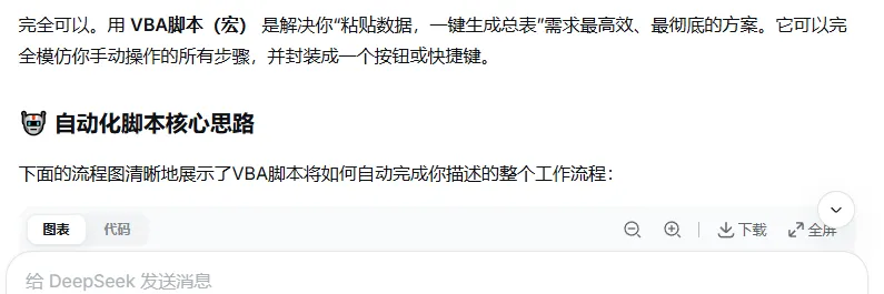 根据deepseek的指引一步一步的操作,过程不顺利,运行脚本时提示宏被禁止,继续提问deepseek。然后再根据deepseek给的指引解决宏被禁止的问题。总的思路就是遇到问题就问deepseek,按他的指引解决问题,直到最后完成整个脚本,整个过程中要注意下面4点: