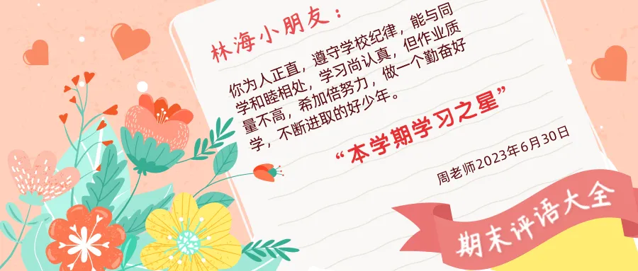 1.你是一个积极向上,有自信心的孩子。学习上有计划、有目标,能够合理安排自己的时间,学习状态挺好;心态平和,关心、帮助同学,关心班集体,积极参加班级、学校组织的各项活动,具有较强的劳动观念,积极参加体育活动,尊敬师长。希望你再接再厉,不满足于现状,争取做的更好。2.你是一个开朗、大方、有礼貌的可爱女孩,团结同学,乐于助人;积极参加社会活动,关心班集体,生活上比较俭朴,热爱劳动,能严格要求自己;学习上认真、有目标,但缺乏吃苦精神;能积极参加班级、学校组织的各项活动,心理素质好。希望你在今后的学习中继续努力,各方面取得更好成绩。3.你是个朴实、勤奋、聪明的女生。听课用心,学习刻苦,勤于思考,有很强的进取心,能克服在外求学的诸多困难,有较强的生活自理能力,能吃苦,与人为善,尊敬师长,积极参加班级事务,学习成绩优良且稳定。望继续努力,始终保持稳中有进的态势,相信你会做的更好。4.你是个既聪明又勤奋,有思想、有目标的男生。善于思考,听课认真,做事仔细,尊敬老师,友善同学,尤其是热情为班级服务,协助老师工作,具有很好的综合能力。学习处事都能冷静面对,成绩优良且较稳定。品质好,潜力大,相信你会更加努力,学无止境,争取更好的成绩。5.你是一个内心世界丰富,但不善表达的男孩,你有思想、聪明。在班里你团结同学,劳动踏实,有集体荣誉感。在学习上你能认真听老师上课,作业能按时完成。老师记住了你的优点。老师希望你在学习上再刻苦些,对不会的问题要大胆地问,注意学习方法。老师相信你一定能做好。6.你是一个言语不多,性格文静的女孩。在班上你能团结同学,尊重老师,思想品德好,劳动踏实。学习上你能按时完成作业,学习目的明确,同时你的自理能力很强。7.或许你有些调皮,有些好动,也常挨批评,其实在老师心中,一直认为你很不错。你劳动积极,憨厚可爱,脸上总是挂着笑容。如果你能在每次尽情玩耍后,静下心来认真思考,勤奋学习。那么,你也可以成为一名佼佼者。试试看,老师等你的好消息。8.当看见你认真学习的身影时,当阅读到你令人仿佛身临其境的佳作时,当看到你书写的一行行规范字时,当听到你深情并茂的朗读时,老师倍感欣慰,你成长道路的每一步足迹都很踏实。继续努力吧,将来你定会成为国家的栋梁。9.老师真的很喜欢你!你真是太棒了!勤奋好学,思维敏捷,优美的文笔,一手漂亮的好字,课堂上精彩的回答?你品学兼优,令老师赞叹,同学们羡 慕。老师希望在今后的学习中,你能更大胆地施展自己的才干,你将会赢得更 多的掌声和荣誉。10.你是一个令家长欣慰,令老师骄傲的乖乖女。温顺平和的性格使你与身边的每个人都相处得很好。你聪明、认真,成绩优秀。最让老师忘不了的就是你的那一篇篇佳作,让老师领略到了你那不凡的才气。继续努力吧,成功是永远偏爱勤奋者的!11.你是一个思维活跃的小男孩,你爱表现自己,上课时能经常看见你高举小手,老师也从你的谈论中了解到课外知识丰富,但在平时的学习过程中 “认真” 二字做得不够,希望你再接再厉,自觉学习,做一个全面发展的好学生。12.你是个聪明活泼而且非常可爱的小女孩。平时能歌善舞、兴趣广泛、思维敏捷,特别使老师高兴的是:你的语言是多么丰富,多么与众不同,简直棒极了!老师相信,如果你以后对待同学更友善些,对待长辈更体贴些,你会是个更受欢迎的女孩!你也会获得更多快乐!13.你是一只幸福的小鸟,爸爸妈妈用爱梳理你的羽毛,老师用教育锻炼你的翅膀,你没有辜负父母、老师的期望,很好地完成了各项任务,成绩非常优秀,老师为你取得的成绩而欣慰。希望你“百尺竿头,更进一步!14.你总是默默无语地认真学习,即使遇到了挫折也毫不气馁,沉静之中带着几分倔犟,淳朴之中透着踏实。每次打开作业都能欣赏到你清楚的字迹。虽然这学期妈妈生病了,家人关心你的时间也没以前多了,但你各方面反而更自觉懂事了。你会取得好成绩的,我始终对你充满信心。15.你生性好动,聪明活泼,同学们都很喜欢你。老师最喜欢听到你响亮而又有感情的回答,同学们最喜欢听到你生动而有趣的故事。如果你写的作文像你的故事那样生动、感人就好了,愿老师的信任。同学们的微笑伴随你走向一个个新的奋斗目标。16.你是一个爱学习,很懂事的孩子,平时能主动帮助学习上有困难的同学,班级工作认真负责,是老师的得力小助手,是同学学习的楷模。希望你再接再厉,再创佳绩,记住:成功是永远偏爱肯努力、多付出的人。17.在老师眼里,你是一位很乖巧、可爱的女孩,你的嗓音清脆甜美,学习认真,字迹工整漂亮,可为什么在老师和同学们面前却言语不多呢,其实你挺不错,大胆表现吧,你将会更优秀的。18.在学习上你表现出色,在班级工作中你也能尽心尽责,你的聪明、你的灵气老师看在眼里,喜在心上,常言道:金无足赤,人无完人。希望克服“粗心” 的小毛病, 时刻只要严格要求自己, 不断完善自己, 相信成功就在不远处等你!19.你是一个很有礼貌,较懂事的女孩。你像一只快乐的百灵鸟,你热爱集体,助人为乐。学习上较刻苦,老师提醒你书写一定要规范,希望你能更胆大心细,刻苦努力,做一个品学兼优的好学生。20.你是一个善解人意、乐于助人、文明礼貌的孩子,老师真希望你能有更多的优点,比如上课听讲再认真一些,课后作业完成得