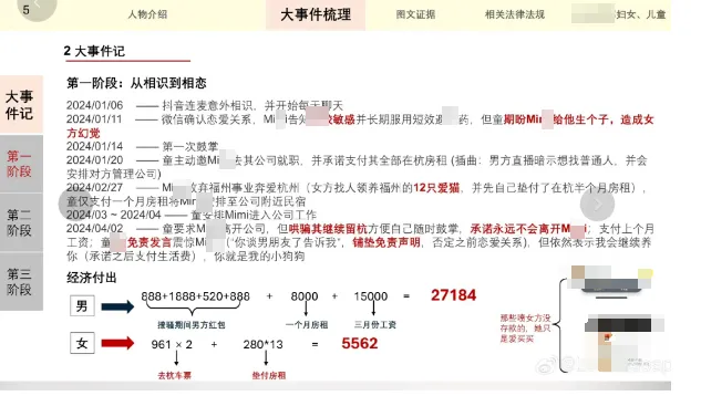 日前,随着虎牙娱乐版块顶流男主播童锦程被女网友曝光疑似有私生子事件,该事件已然登顶全网多平台热搜,在全网发酵受到无数网友议论不断! 这些天,女网友借此事件也是收获过亿话题的流量,这几天该女网红开播直播间在线突破万人,无数吃瓜网友纷纷涌入其直播间刷屏弹幕吃瓜,后续外界更是传出童锦程现正牌女友疑似怀Y的消息,再次让童锦程孩子的话题推上风口浪尖! 随着时间的推移,本以为此事件的热度也随之逐渐慢慢消退。但就在昨日,再次爆出PPT猛料,再次让童锦程生孩子事件被广大网友热议! 首先PPT的截图中第一段介绍了女主跟童相识相恋的第一阶段以及两人通过语音直播连麦认识。 双方加上联系方式后,童问她是否跟着我不?让女方误以为两人已经确认了恋爱关系,同月份女方告知童自己对橡胶过敏并且在服用短效避Y药,对此童还说出想让你生个子,想要一个小孩是真的这种暗示性话语。 当月底,童邀请女方去自己公司就职,并承诺为其支付房租,一个月后女方辞职前往杭州,女方门禁视频以及入职后的钉钉皆有聊天记录,但只工作一个月童便要求女方离开公司,并且希望女方离职后依然留在杭州,可以每个月给生活费。 同时,童说如果女方谈了男朋友就告诉他,女方恍然童并不觉得两人之前的关系是恋爱关系,最后女方算出了恋爱期间,两个人的经济付出,童总共花费2W多,女方花费5000多,至此,两人相识相恋第一阶段结束。 昨晚,童漾妈直播聊到了她昨天发的与童相知到后来纠缠的事件始末ppt,称自己只负责截图,不是自己亲自做的,还说自己当初放弃事业是以为童会给她更好的事业,一步错步步错!