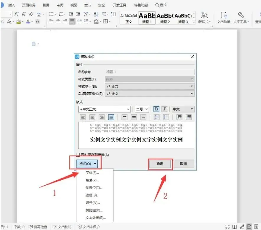 接着,在弹出的修改样式面板中,选中【格式】选项,对该选项卡下的字体、段落、制表位、边框、编号、文本效果进行调整设置: