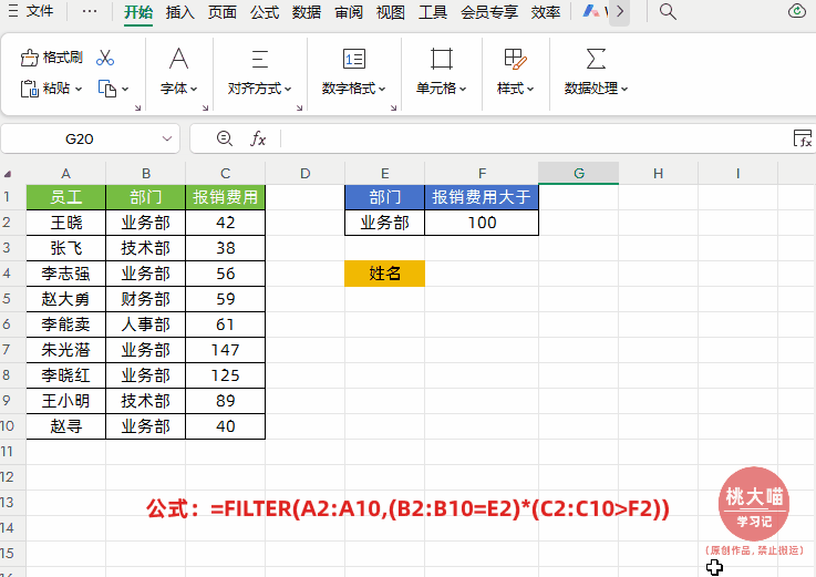 如下图所示,需要查找部门为“业务部”,并且报销费用大于100的所有姓名。