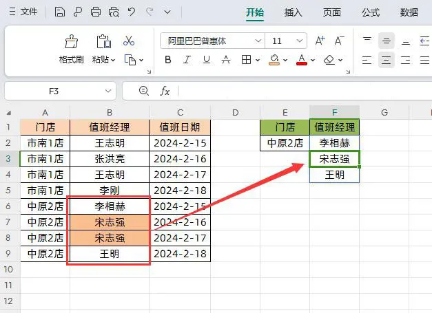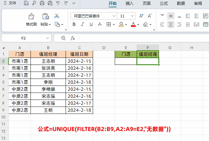 公式中首先通过FILTER函数,按条件筛选出指定门店的值班经理名单,然后再通过UNIQUE函数提取出不重复的名单数据即可。