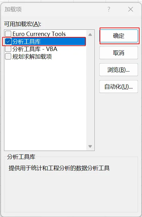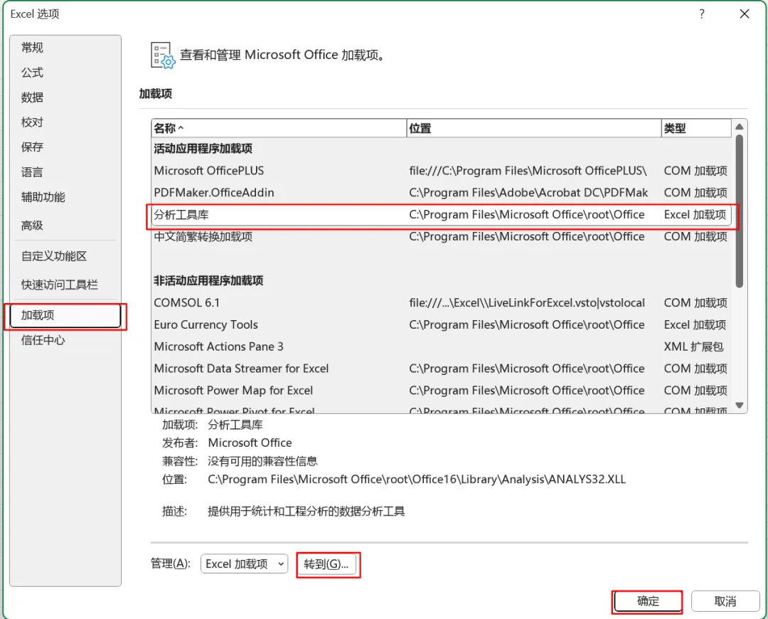 打开Excel文件,分别点击‘文件-选项-加载项-分析工具库’,点击下方的‘转到’,勾选‘分析工具库’,最后‘确定’。