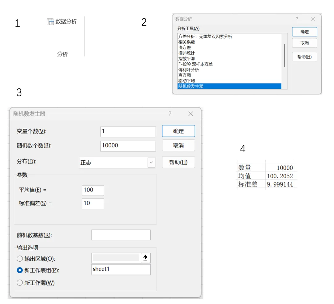 在数据菜单栏中会出现分析功能,点击“数据分析”后进入随机数发生器界面,按照上面的条件“共计10000片,其重量均值是100g,总体标准差是10g”设置随机数发生器的参数,最后我们得到了10000个数据。随后我们用count函数,average函数和stdev函数确认生成数据的参数,是没有问题的。
