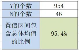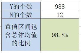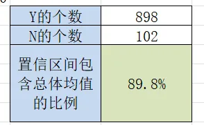 第一次抽样的置信区间是否包含总体均值:AD2=IF(AND(AB2<100, AC2>100), "Y", "N")