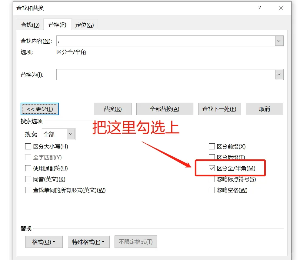 ✔️ 勾选☑️“区分全角/半角”就可以了。