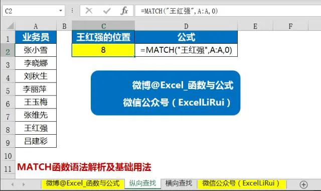 连起来就是在A列中查找和“王红强”完全匹配的数据,并返回其位置。