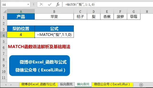 连起来就是在第一行中查找和“梨”完全匹配的数据,并返回其位置。