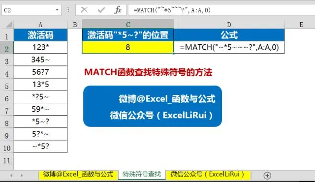 上图中A列是数据源区域,放置了很多激活码,由数字和符号构成,现在需要查找激活码“*5~?”的位置。