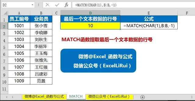 上图中A:B列是数据源,放置着员工编号和业务员姓名,要提取B列最后一个文本所在行号。
