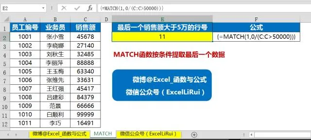 上图中左边是数据源,包含业务员的编号、姓名和销售额,现在要查找最后一个销售额大于50000的业务员所在行号。