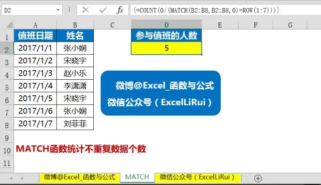 在上图中左侧是数据源,包含值班日期和值班人员的姓名,其中值班人员有重复,即有的人值班过多天,现在要计算参与值班的人数(排重后)。