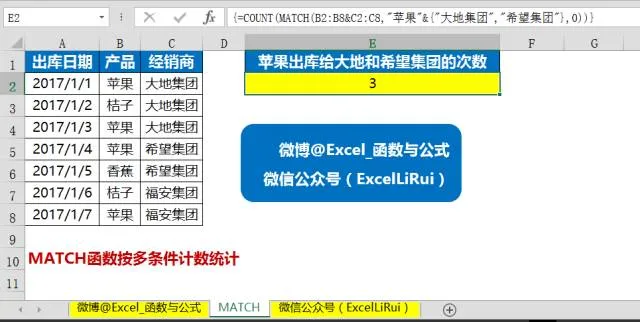 =COUNT(MATCH(B2:B8&C2:C8,"苹果"&{"大地集团","希望集团"},0))