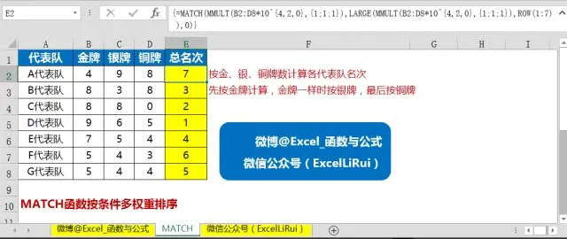 上图中左侧是数据源区域,包含各个代表队在某次赛事中取得的金牌、银牌、铜牌数量,现在需要根据各个代表队的奖牌数量计算其总名次。