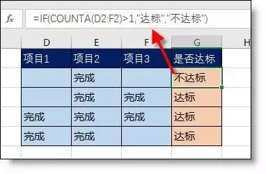 示例:下表D:F列中,如果填充“完成”大于1个,则在G列返回达标,否则返回不达标。