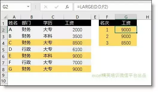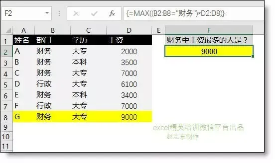 如果上例财务最多工资用新函数Maxifs,公式为: