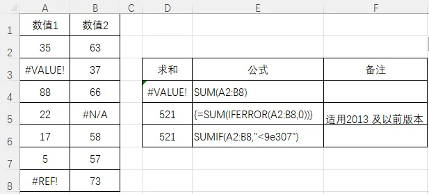 如果你的 Excel 版本比较旧(比如 2013 及以前),用这个方法最稳。{=SUM(IFERROR(A2:B8,0))}