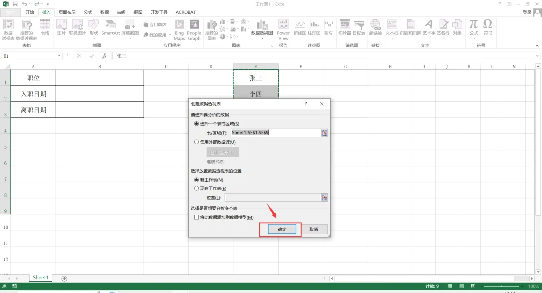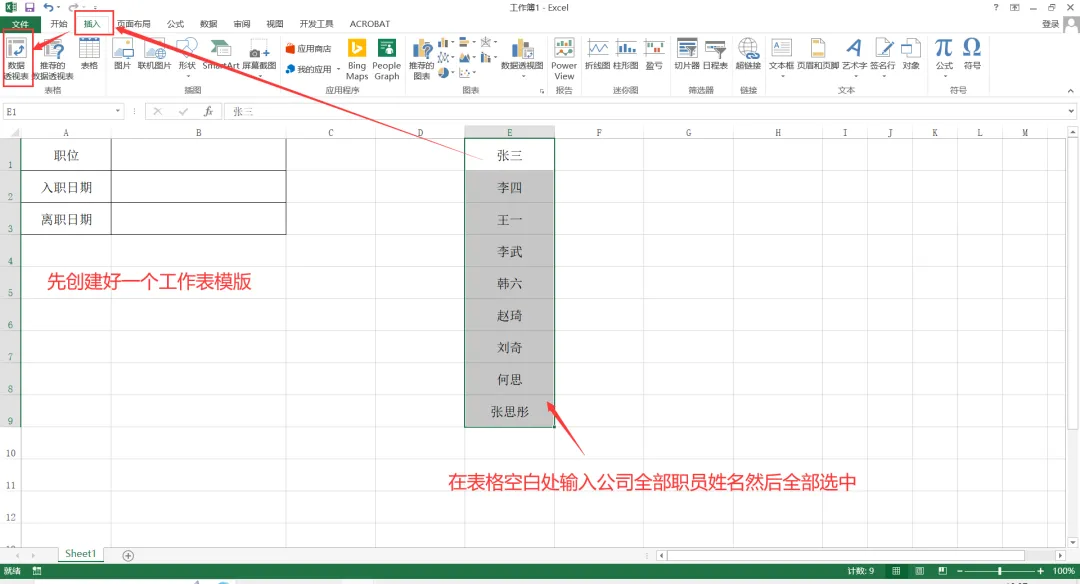 1、新建一个Excel表格,先在表格中创建好一个工作表模版,然后在空白处输入公司全部职员姓名(即需要批量创建工作表的所有名称)并全部选中,再点击【插入】-【数据透视表】,在弹出的“创建数据透视表”对话框中,点击【确定】,新建数据透视表。