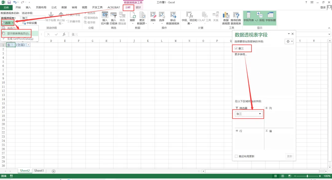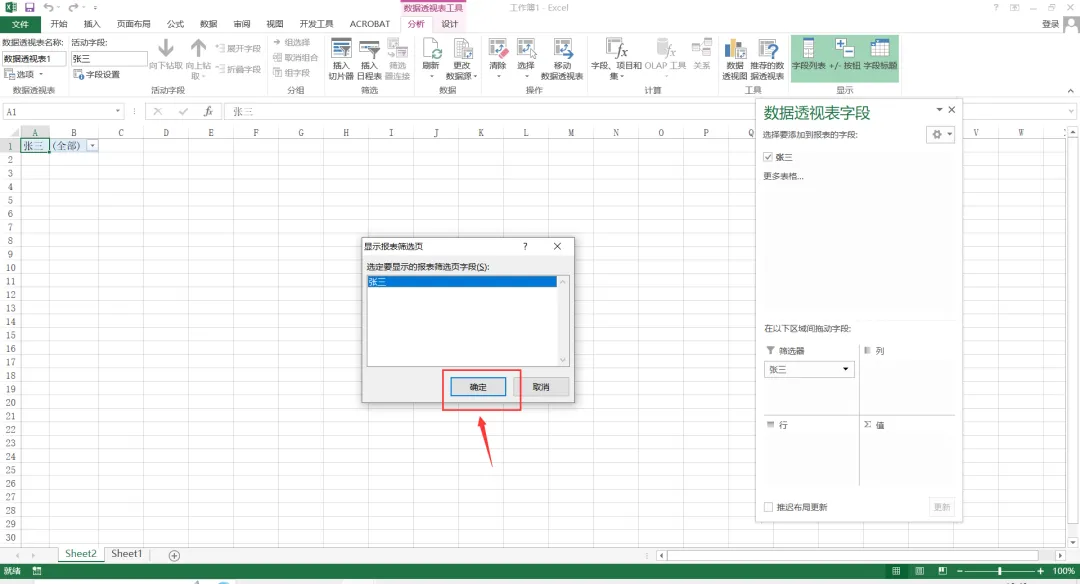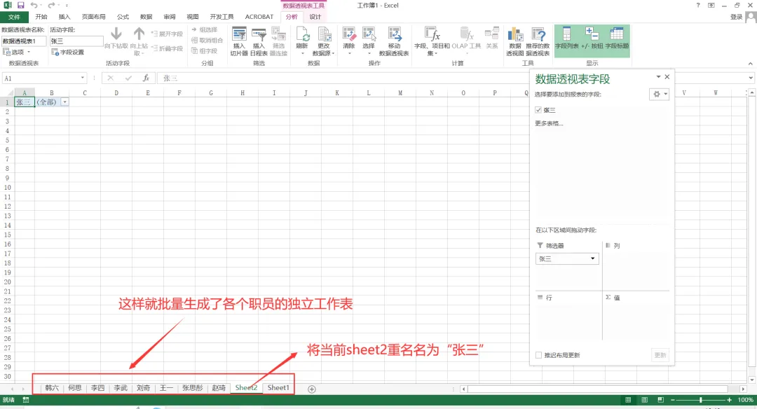 2、在新建的数据透视表中,将“数据透视表字段”框内的字段“张三”拖入【筛选器】栏内,然后点击【数据透视表工具/分析】-【选项】-【显示报表筛选页】,在打开的“显示报表筛选页”对话框中,点击【确定】,这样就批量生成了各个职员的独立工作表,再将当前sheet2透视表重命名为“张三”即可。3、回到步骤1创建的模版工作表sheet1中,将姓名列全部删除,点击表格左上角三角图标,全选工作表,按【Ctrl+C】复制。4、点击第一个职员工作表名称,按【shift】键再选择点击最后一个职员工作表名称,全部选中所有 职员工作表,然后点击表格左上角三角图标全选工作表,再按【Ctrl+V】粘贴之前复制的模版,这样所有工作表都有了相同格式的模版表格。