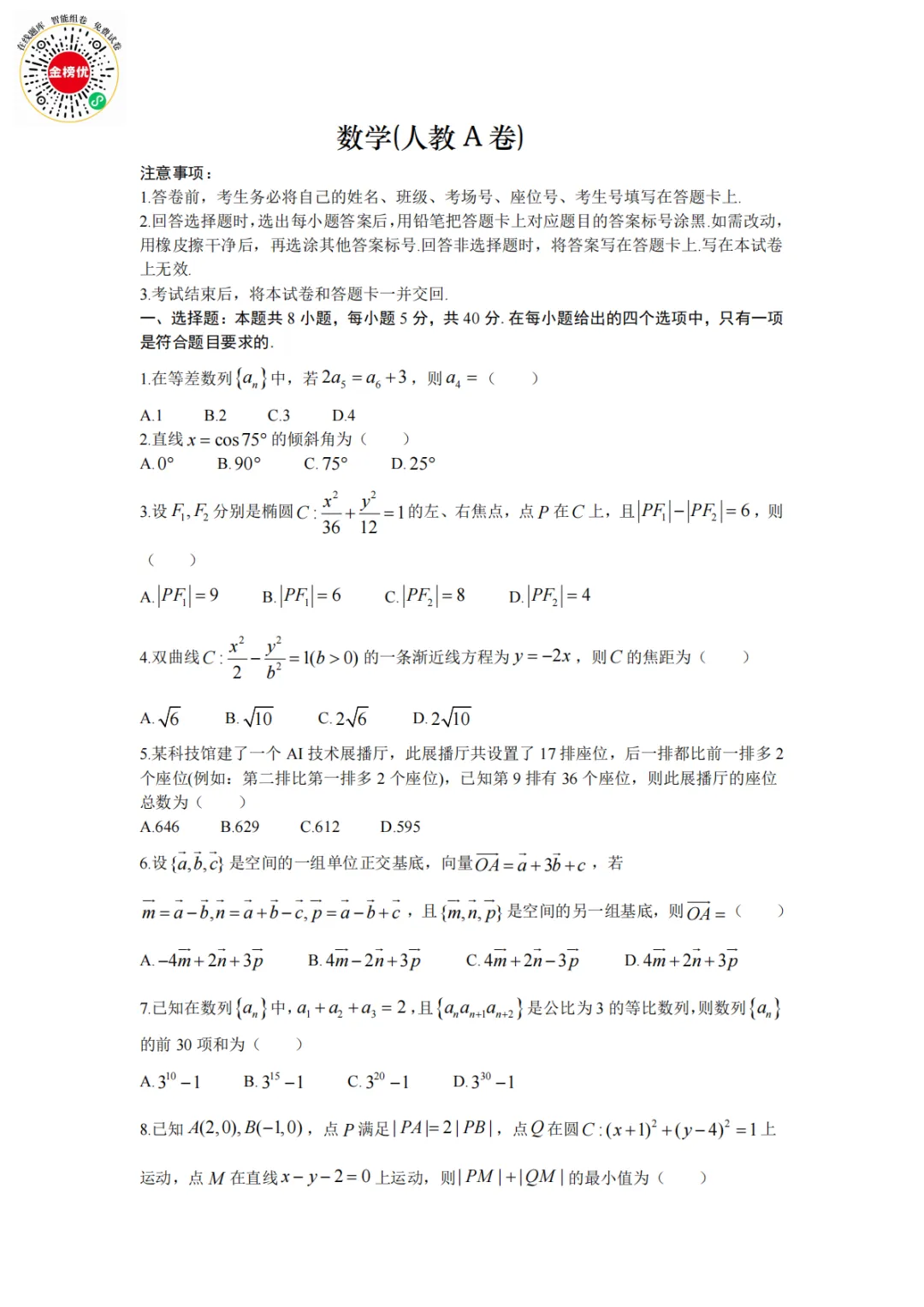 >【精品word版】2026年1月青桐鸣高二联考数学试卷+答案