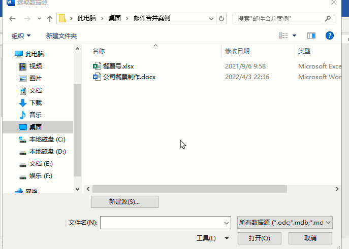 2.在弹出的选取数据源对话框中,找到需要导入的餐票号Excel文件进行导入,导入完成后光标定位在需要插入域的餐号文本框位置,从邮件合并中插入合并域,选择序号即可。