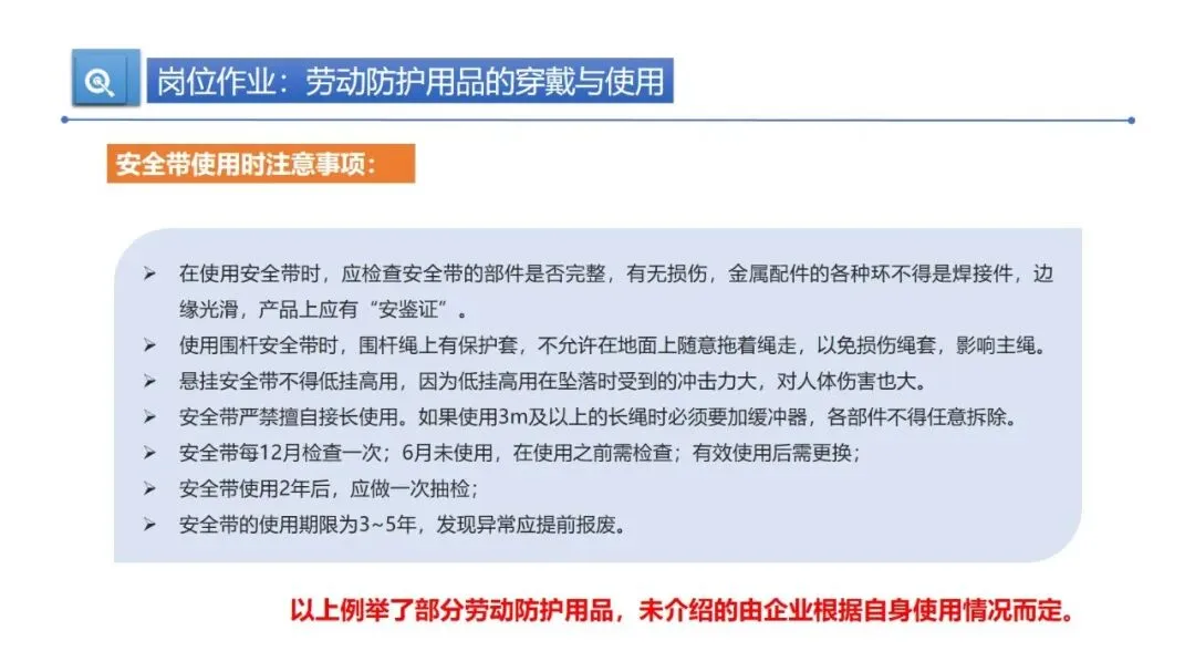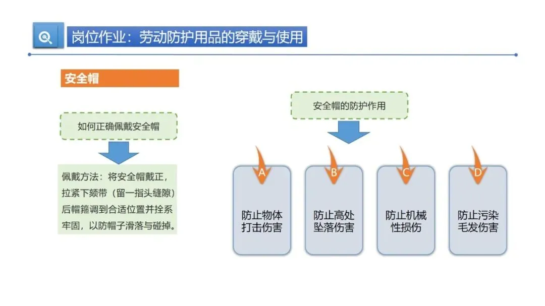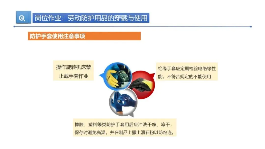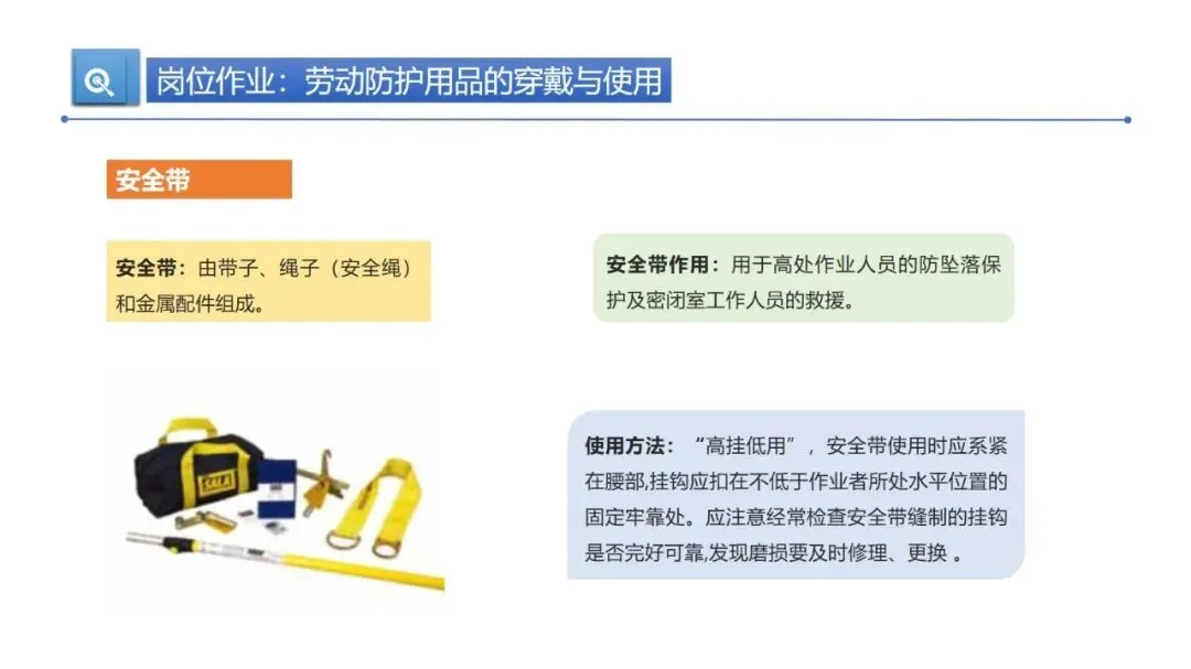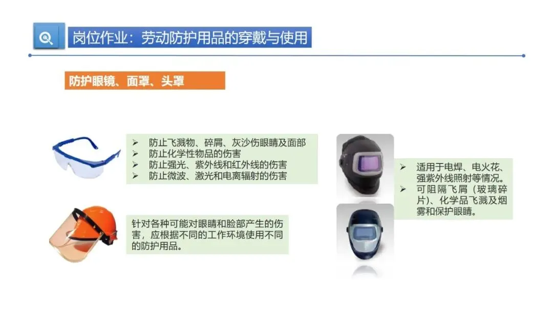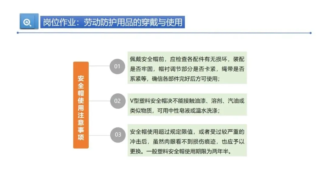 劳动防护用品是作业安全的第一道保障,得用对、用规范。安全帽要戴正,下颏带拉紧留一指缝隙,帽箍拴牢防脱落。使用前要检查配件是否完好,V 型塑料安全帽不能碰油漆、溶剂、汽油,清洁用中性皂液或温水就行。一般塑料安全帽使用期限是两年半,要是超过时限或受过严重冲击,哪怕肉眼看不到损伤,也得及时更换。耳塞、耳罩要专人专用,高噪声环境(>100dBA)得同时用两者。防护手套要按作业类型选,绝缘手套定期检验,操作旋转机床绝对不能戴手套。防护鞋根据场景选钢包头鞋、抗穿刺鞋或绝缘鞋,防护眼镜、面罩能防飞溅物和辐射,安全带必须 “高挂低用”,定期检查,3-5 年使用期限一到就报废。