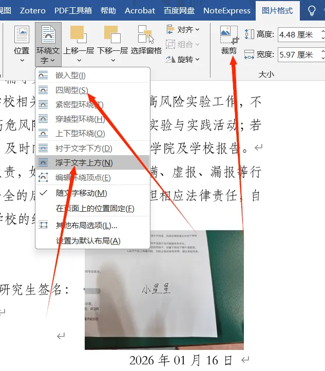 3.把签名照片插入word,看不见图片没关系,先调整图片大小,把高度设置为3厘米的样子方便观看;再通过“