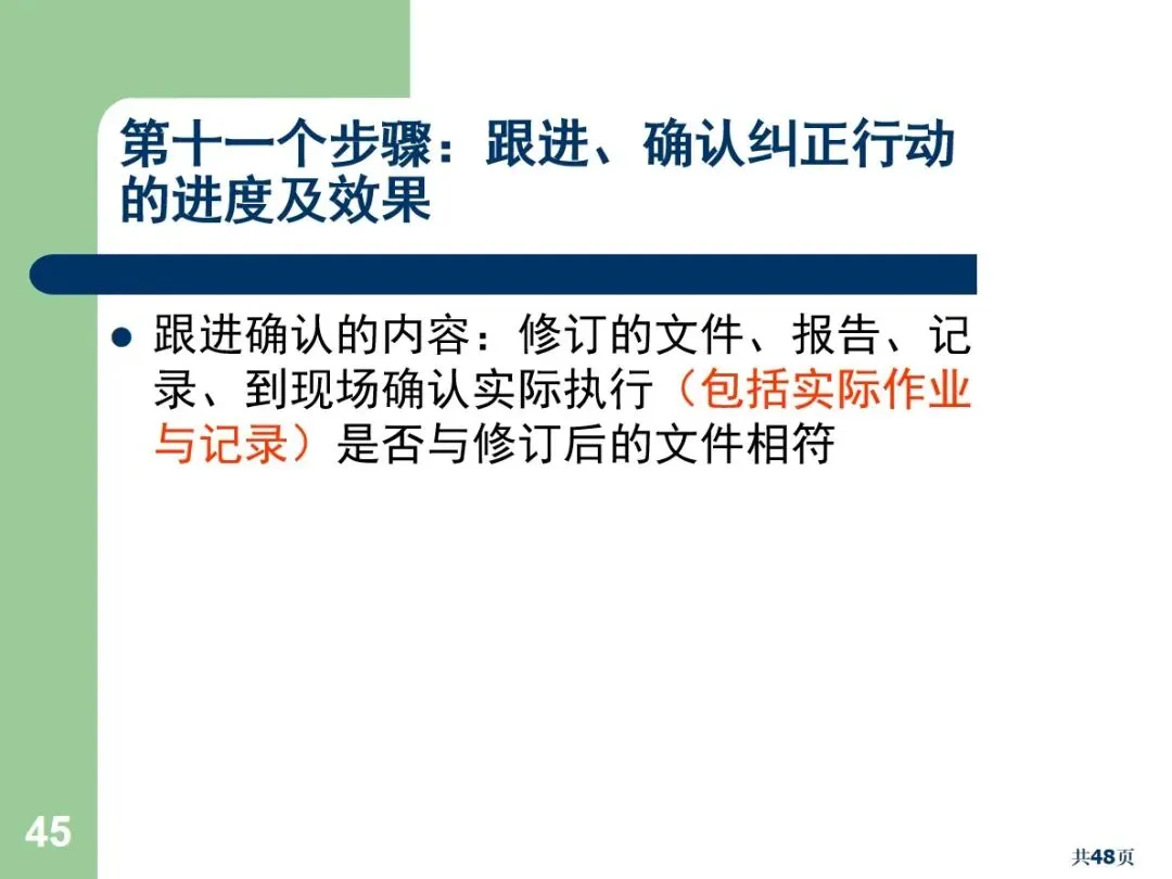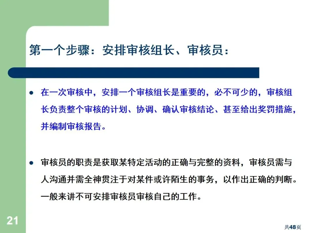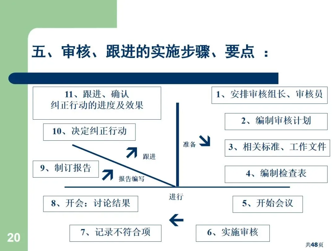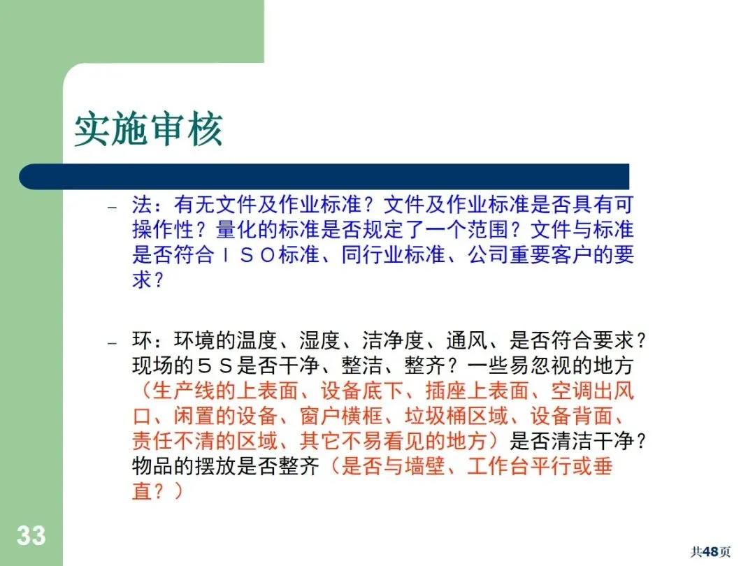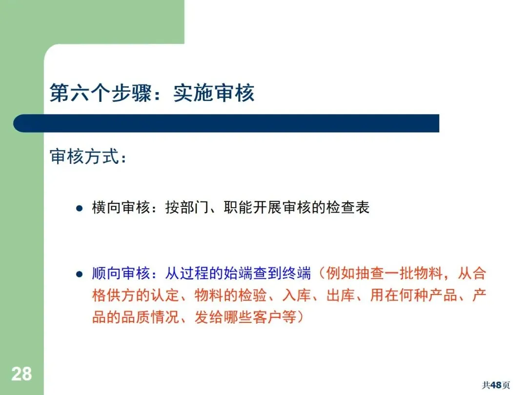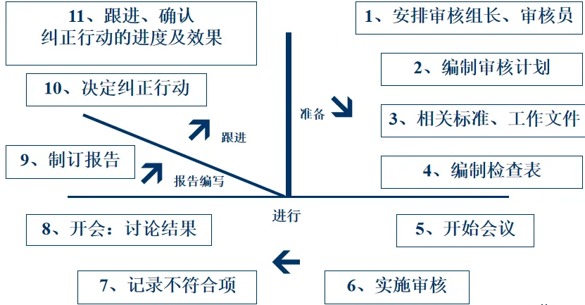 实施审核应按标准程序进行:一是确立审核组长和审核人员,审核组长负责统筹审核计划,协调审核事宜,准备审核报告;审核人员客观、专业、沟通能力强,不能审核自己的工作;然后制定审核方案,包括审核目标、审核范围和审核时间,整理审核所需的相关标准和文档,有针对性地制定审核清单,重点审核高风险和容易出错的环节;在执行阶段,可以采取横向的(部门间)、纵向的(起点到终点)、反向的(终点到起点的)审核方法,使用5W1H1S的提问技术,以保证获得客观的证据;然后对不合格项目进行记录,区分严重的、轻微的和待观察的项目,组织成果研讨会,形成详尽的分析报告,督促相关部门制定整改方案,包括责任人、整改目标、整改时间等;最后,持续跟踪纠正措施的落实情况,确保实际落实情况与修改后的文件相吻合。