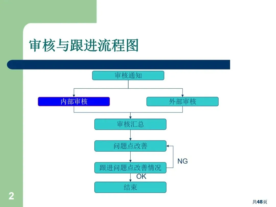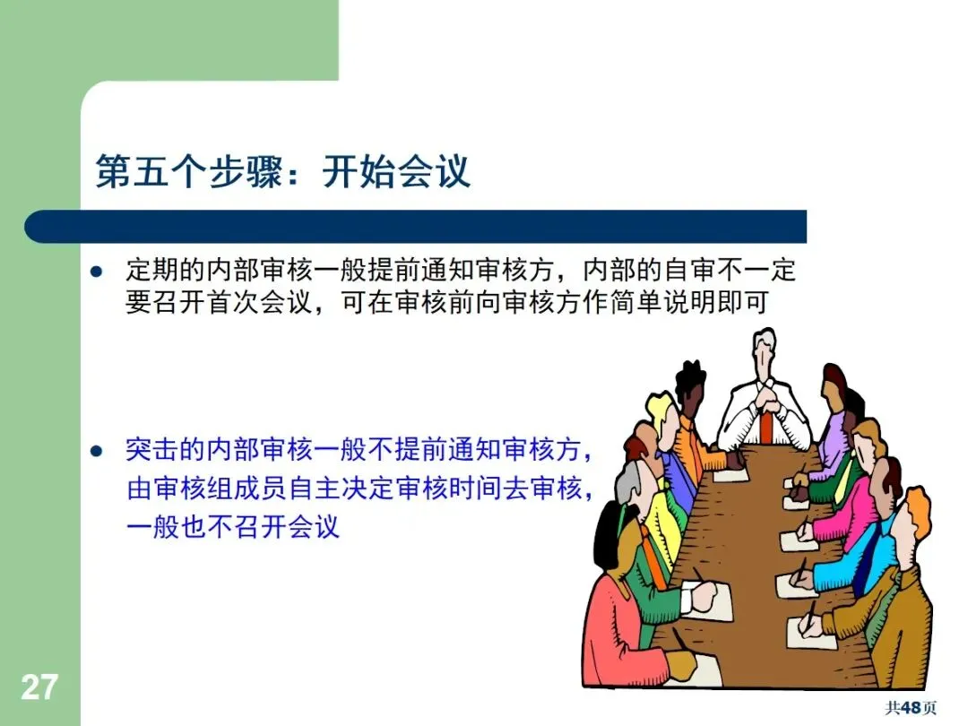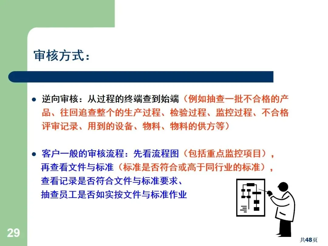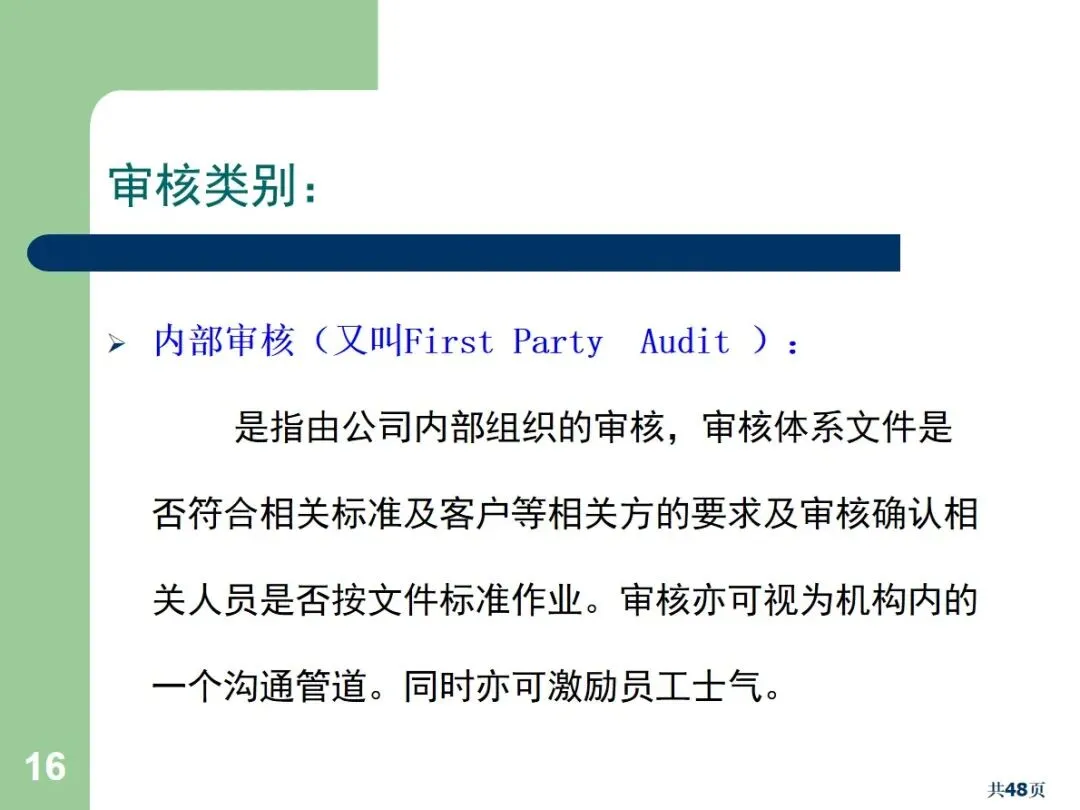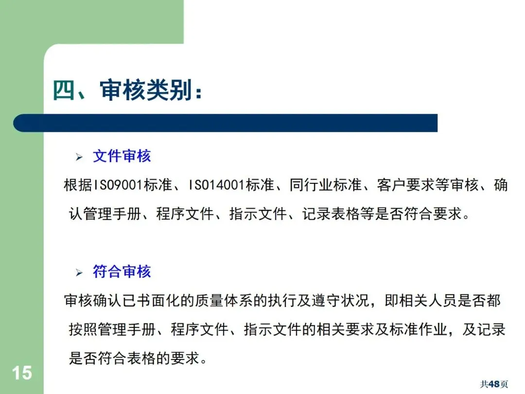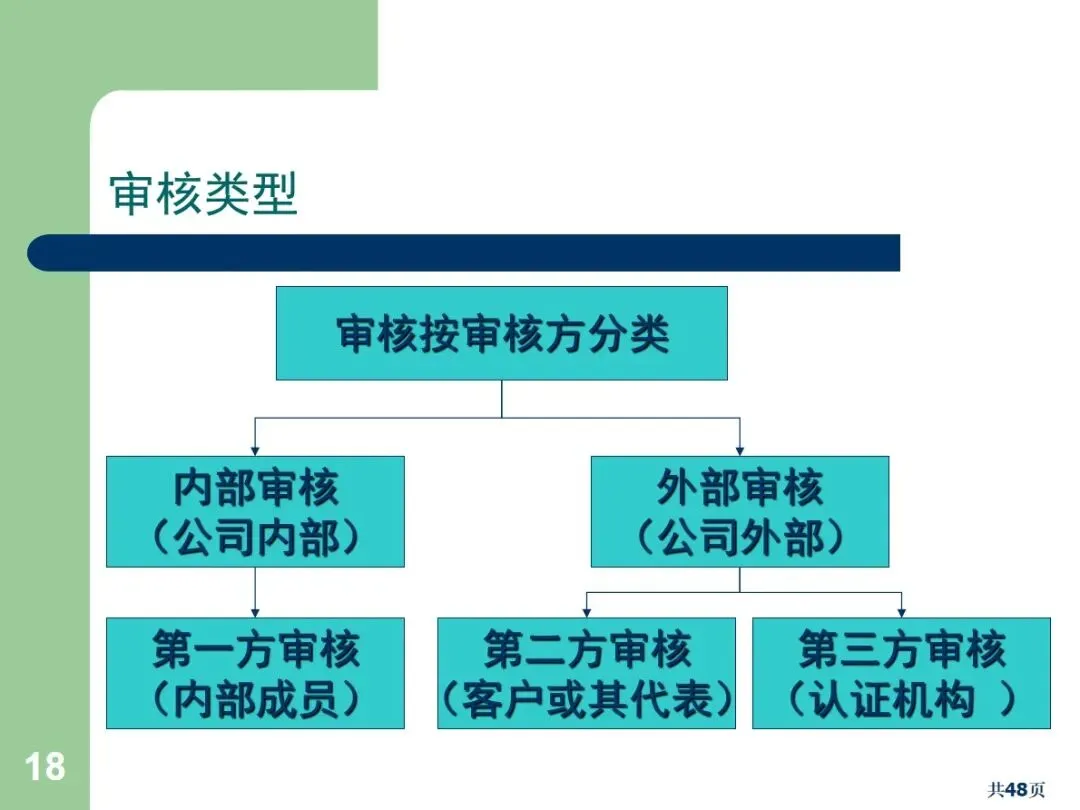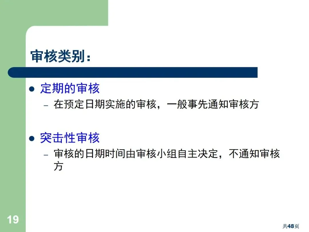 内部审核包括文档审核和合规审核,根据执行方式的不同,可以划分为周期性审核和突发性审核。文件审核主要针对管理手册,流程文件等,以满足规范和顾客的需求为重点;合规审核确认员工的实际操作与文档中的要求相符。定期审核需要事先通报,而突袭审核则不需要事先通报,能够更加真实地反映现场的实际情况。