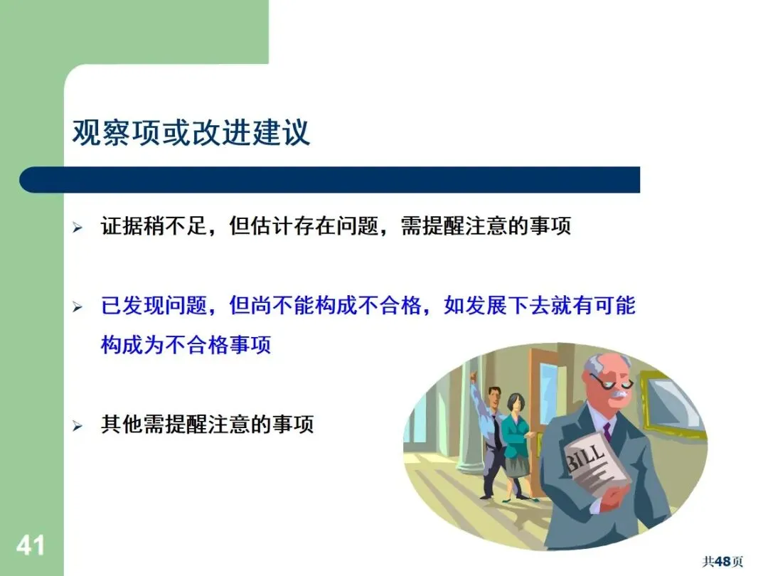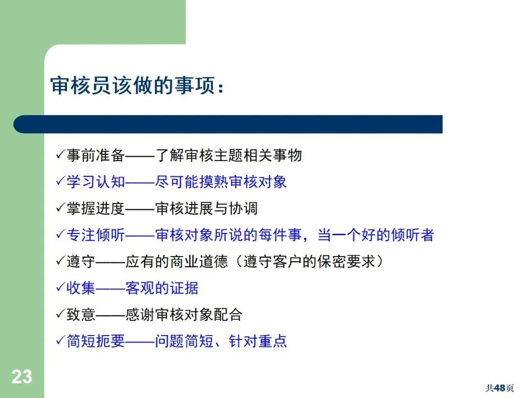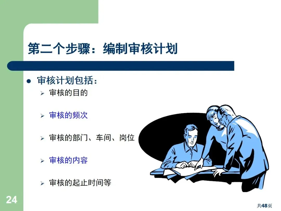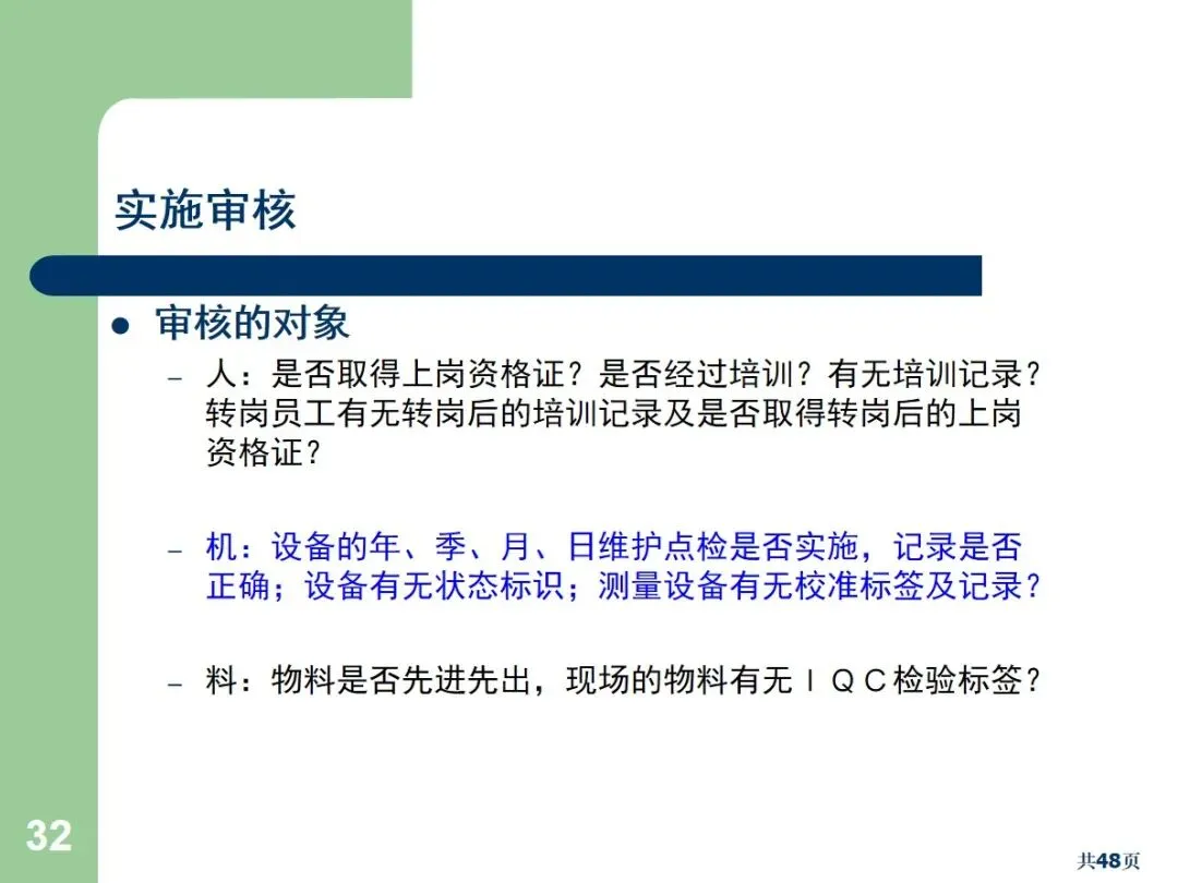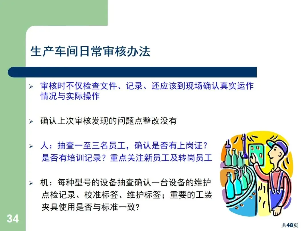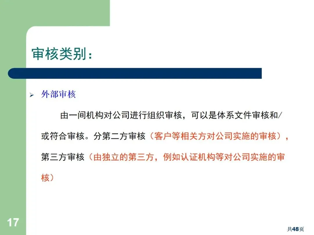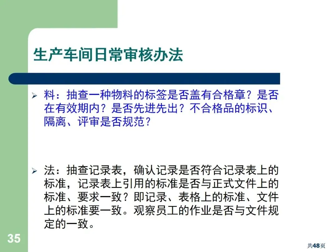 内部审核包括文档审核和合规审核,根据执行方式的不同,可以划分为周期性审核和突发性审核。文件审核主要针对管理手册,流程文件等,以满足规范和顾客的需求为重点;合规审核确认员工的实际操作与文档中的要求相符。定期审核需要事先通报,而突袭审核则不需要事先通报,能够更加真实地反映现场的实际情况。