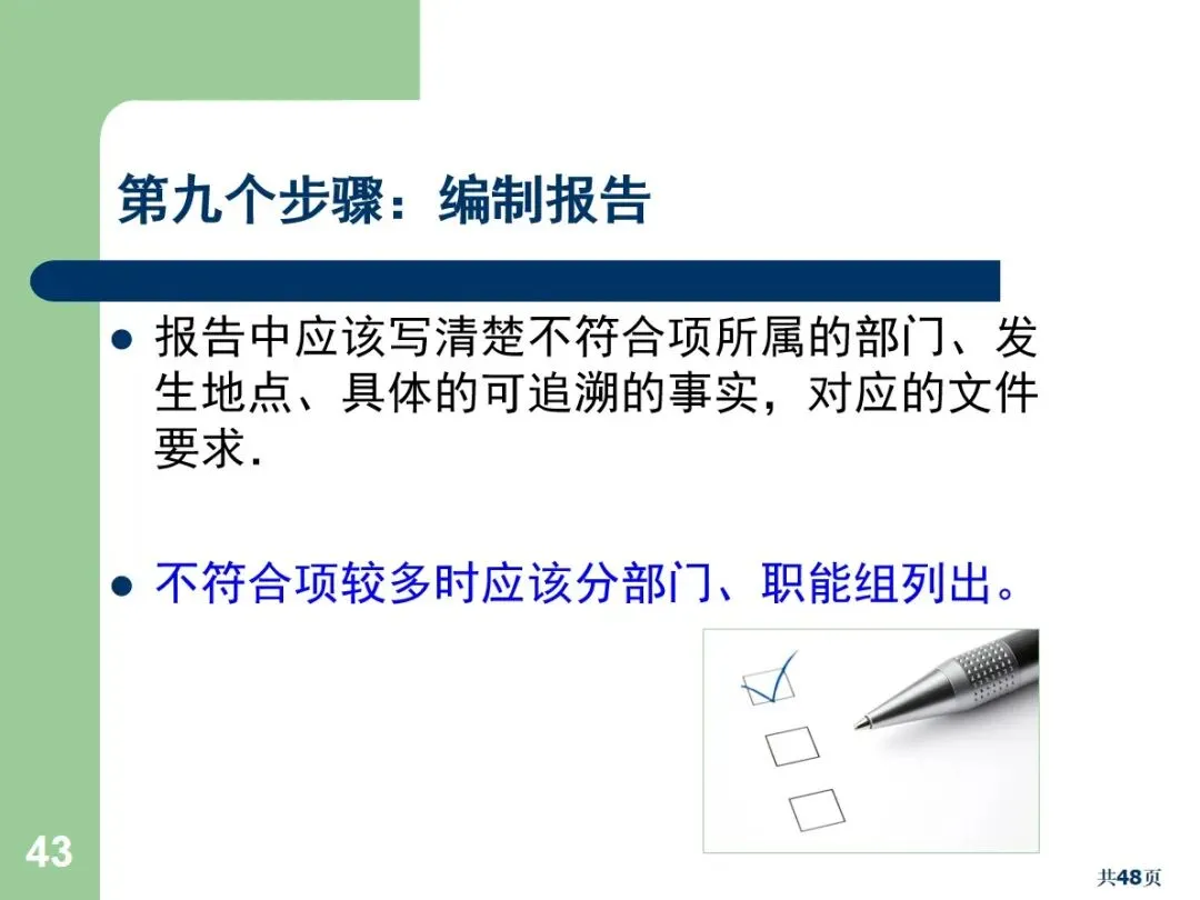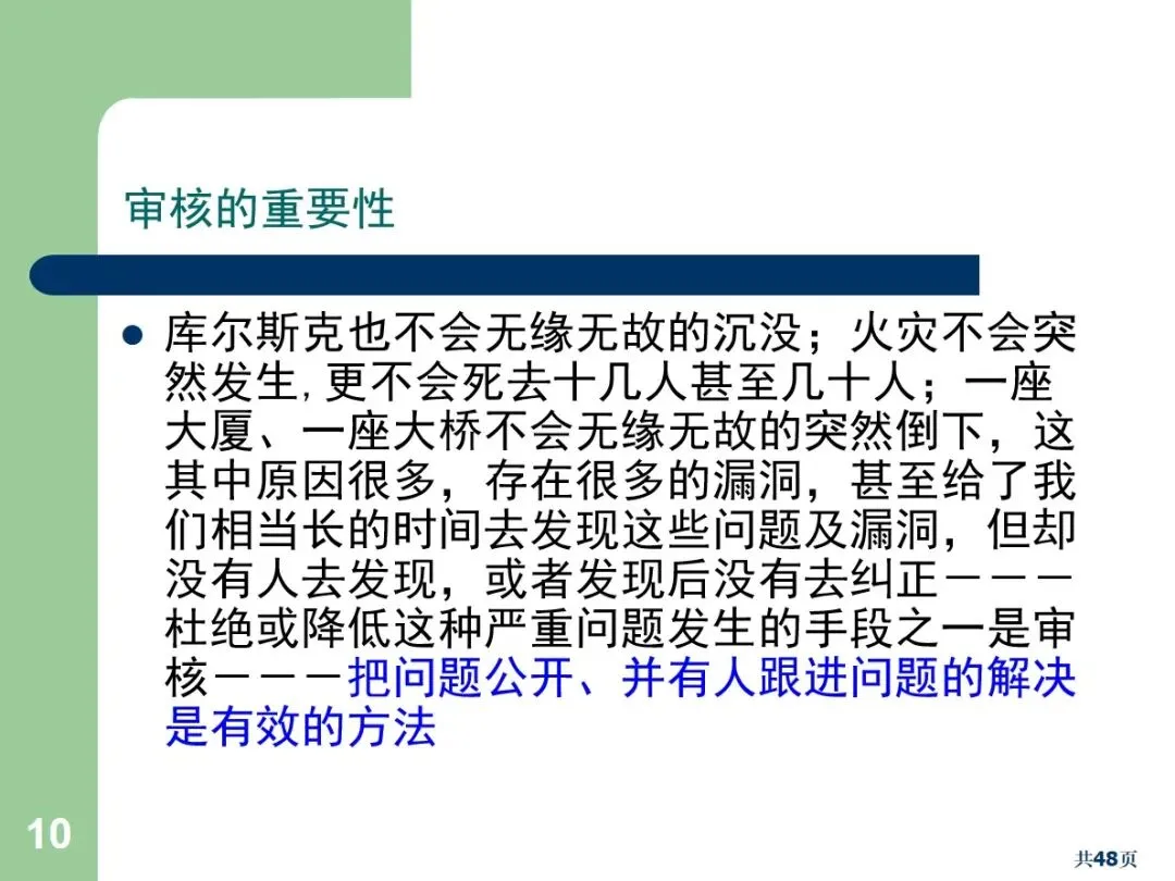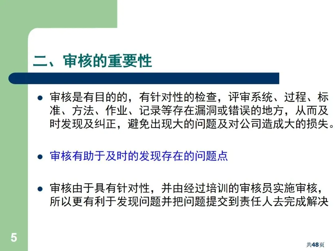 内部审核是企业质量体系中的一个重要环节,是指企业根据ISO9001及其他有关规范,通过系统独立的、文档化的审核程序,对企业的系统运作和实际操作情况进行评价。其核心功能就是及时发现漏洞,及时纠正偏差,防止隐患的累积,降低公司的损失。