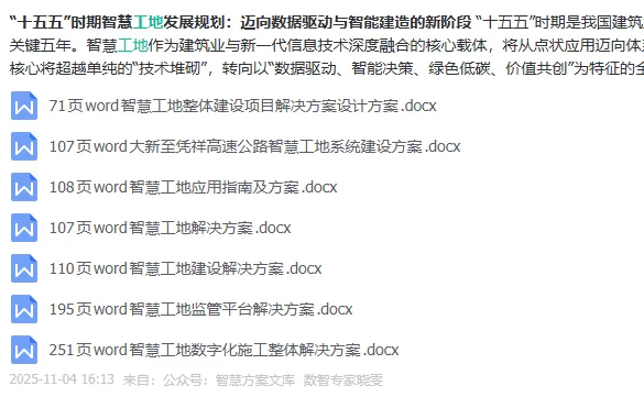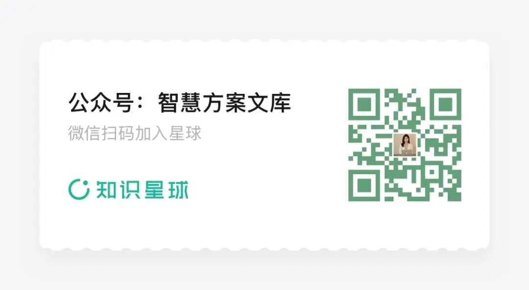 本公众号每日分享高质量售前、可研、设计和建设方案,为了不错过最新资料,建议您先关注再看:知识星球【智慧方案文库】可获取各类解决方案11000份,PPT+WORD超过9000份,持续上传中...),扫码查看清单。