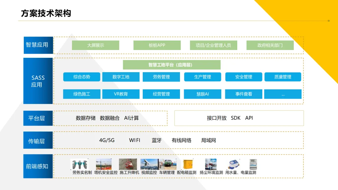技术融合是智慧工地管理体系搭建的核心支撑,通过感知层、传输层、平台层、应用层的四级架构协同,构建“全要素数字化、全过程智能化”的管控闭环,打破传统工地管理的信息壁垒与效率瓶颈。