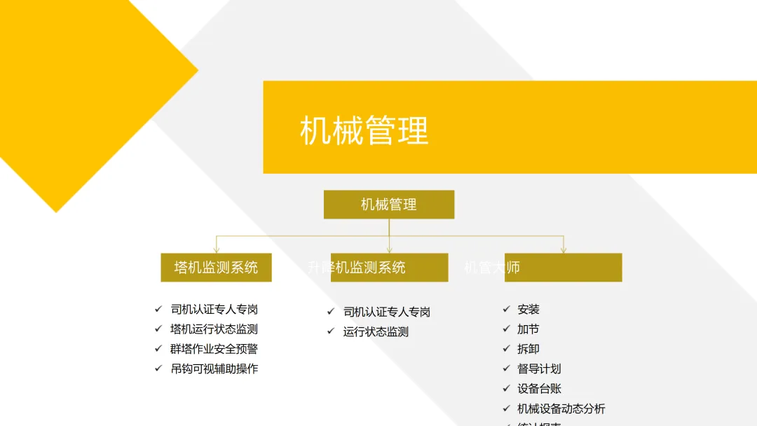 •设备管控精细化:重型机械搭载高精度传感器,实时监测载重、倾角、风速等参数,结合AI算法实现故障预测性维保,减少非计划停机45%以上。