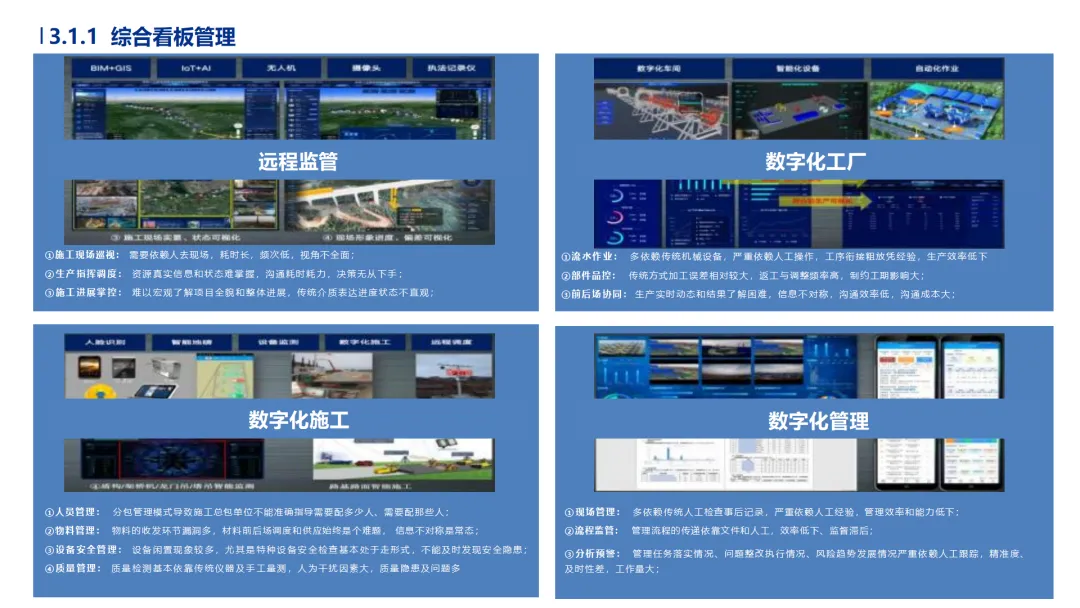 •数字孪生构建底座:以BIM+GIS+CIM融合技术为核心,实现物理工地与虚拟模型精准映射,中建三局平台已覆盖200余个项目,施工模拟、进度预测误差率低于3%。