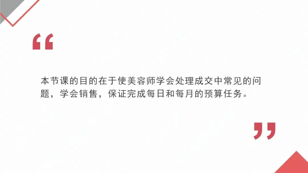 目的在于使美容师学会处理成交中常见的问题,学会销售,保证完成每日和每月的预算任务....