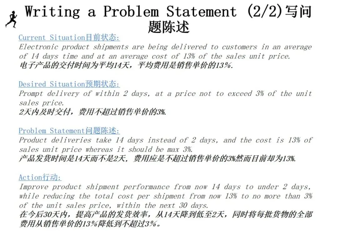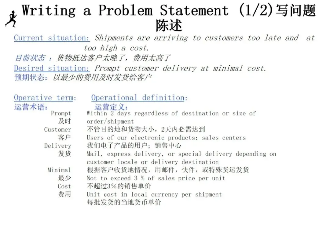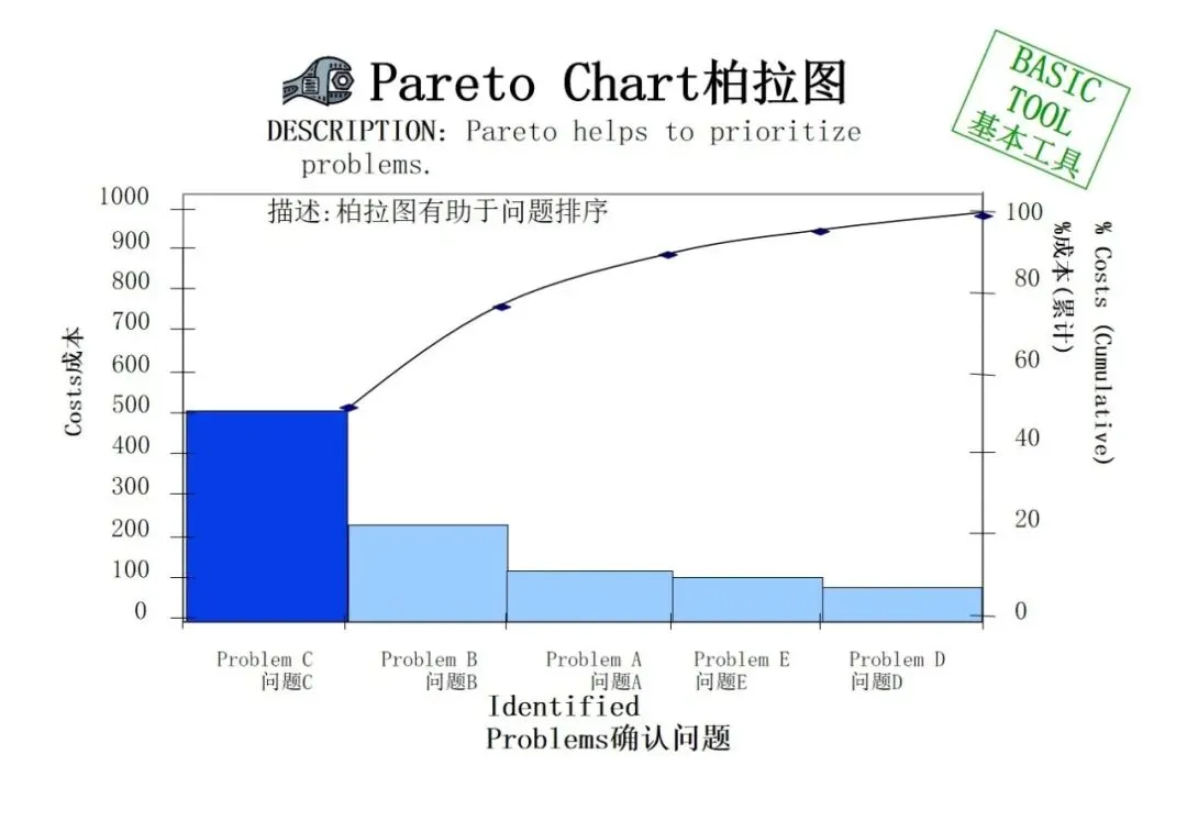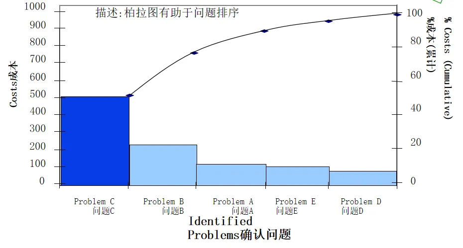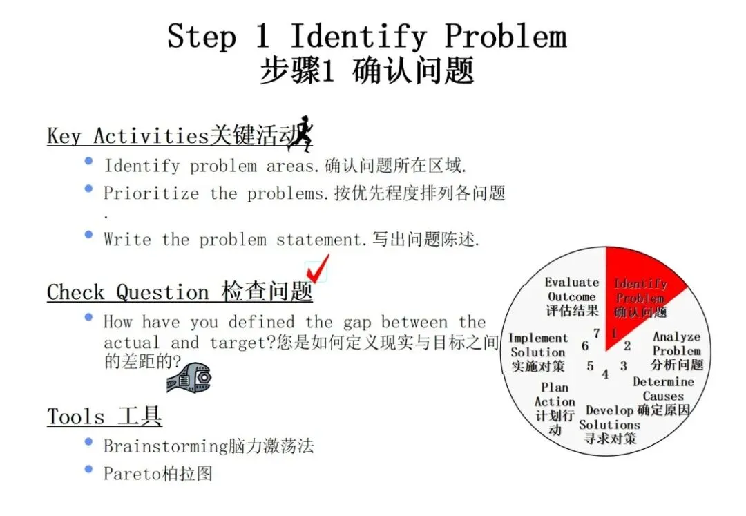 第一步就是要确定问题,重点是要讲清楚现实与期望之间的差距。先找出问题集中的地方,确定优先级,然后用一句话把问题表述清楚——要有具体的数据,发生的频率,花费的多少,不要扯到原因上,也不要预先设定解决方法。常用的方法很简单:头脑风暴法,集思广益;柏拉图根据影响的大小,对问题进行排序,优先处理最重要的冲突。