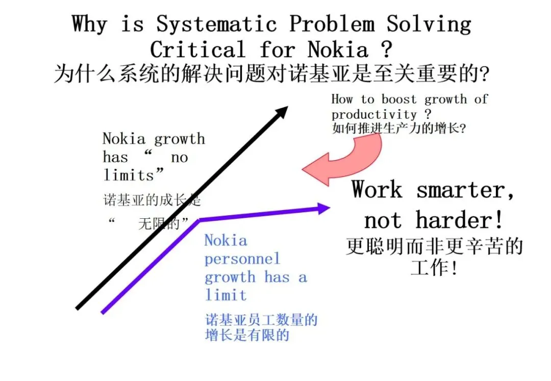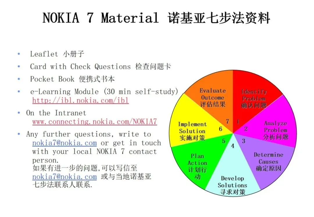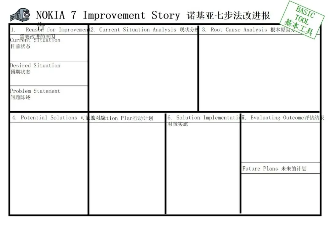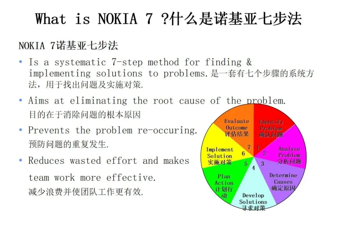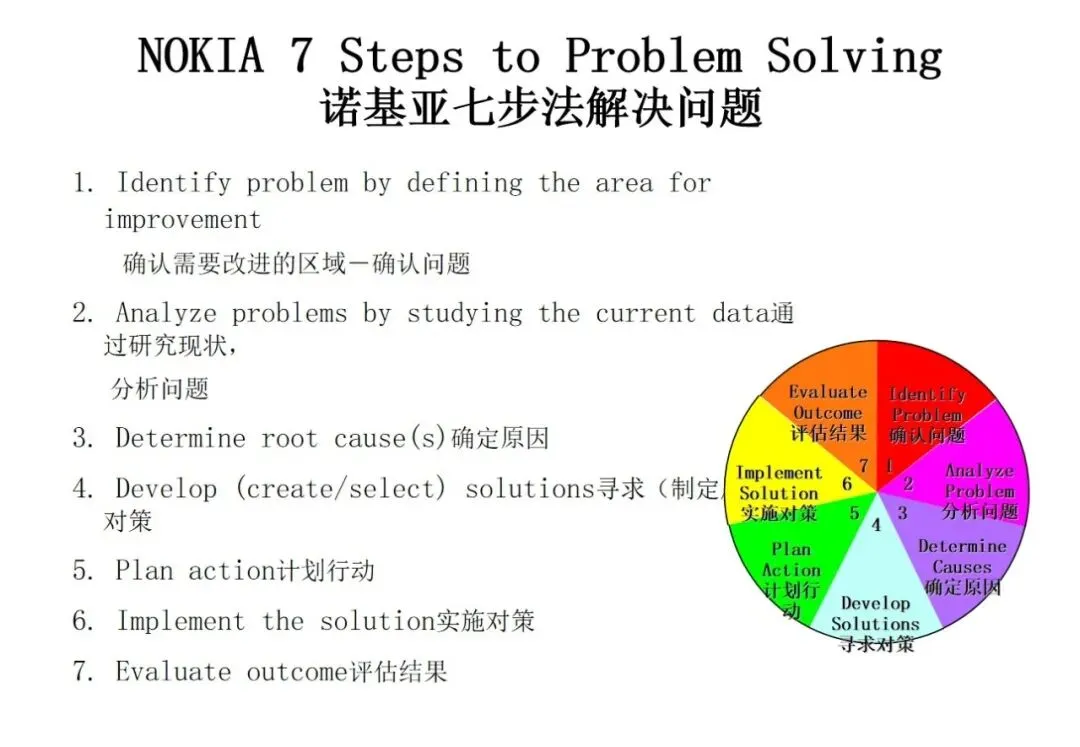 诺基亚“质量改善七步法”是一套非常实用、系统的问题解决方案,其核心在于找出问题的根源,杜绝重复,减少不必要的工作,同时也能提高团队合作的效率。这套体系的产生也是非常现实的,诺基亚想要无限发展,但是员工的数量却是有限的,所以这套体系提倡的是“巧干而非蛮干”,通过标准化的流程来帮助企业提高效率。无论是办公用品采购之类的小事情,还是生产软件设计之类的大事情,它都可以派上用场,花上数天甚至数月的时间去解决,但是它的核心逻辑是不会改变的。