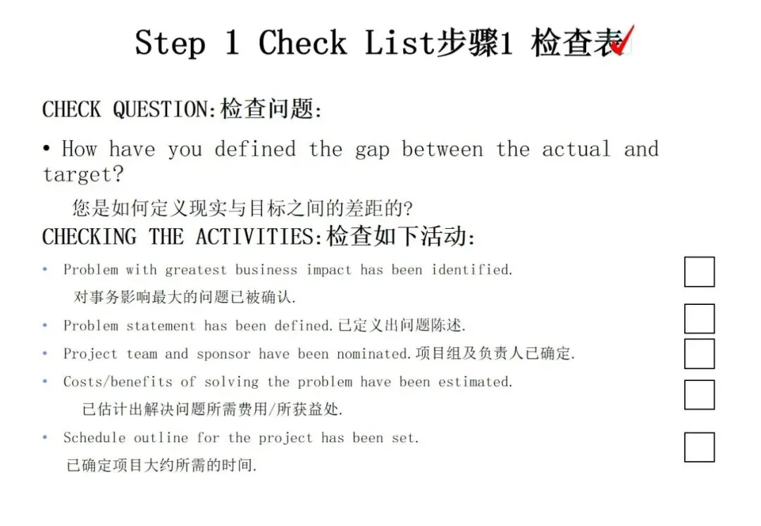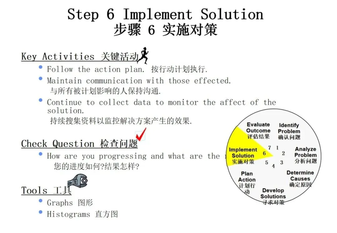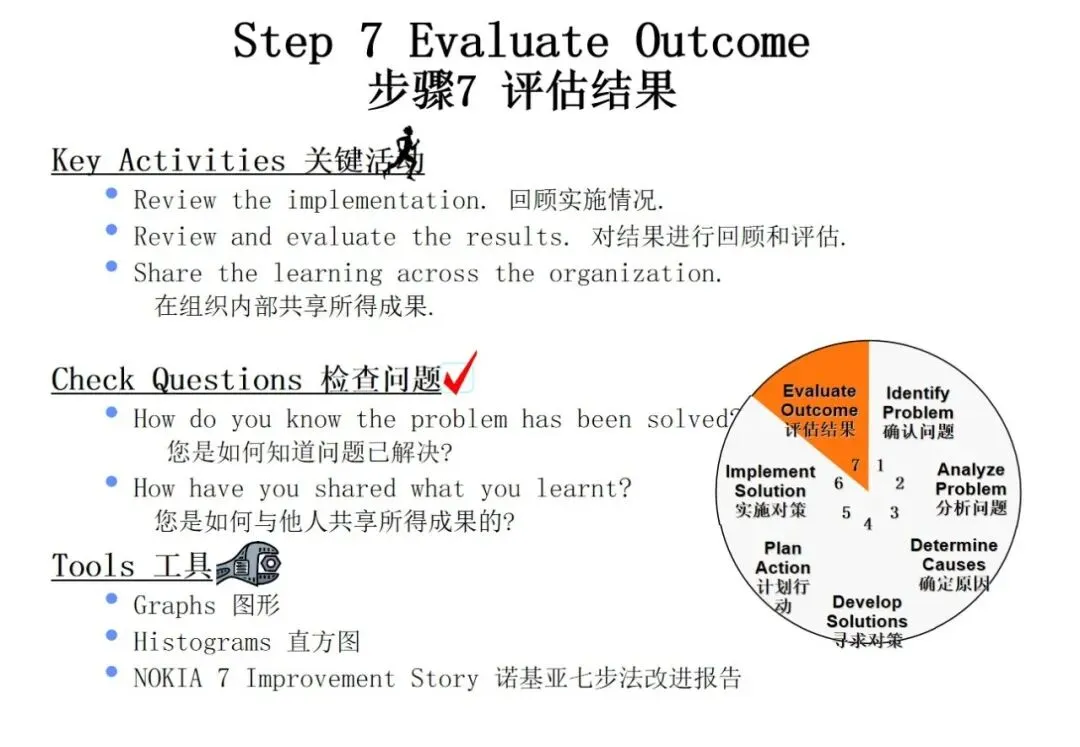 第七步对结果进行评价,以确认效果和积累经验。首先确认已确定的问题和差距是否得到了真正的弥补,然后对团队绩效和业务结果进行评估,最后将总结出的经验分享给公司,以便在将来出现相似的问题时可以直接借鉴。