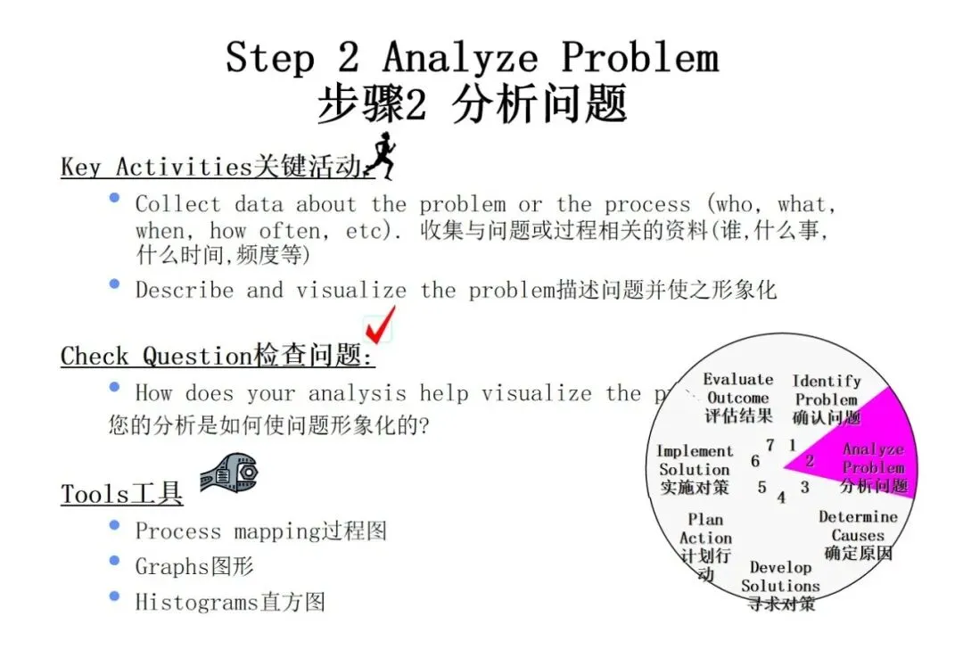 分析问题的第二个步骤,其核心是要搞清楚这个问题。收集「谁,什么事,什么时候发生」的相关资料,然后以流程图显示活动的关联关系,或以圆饼图,柱状图,柱状图将资料可视化,让问题在哪里,何时发生,如何发生,一目了然。