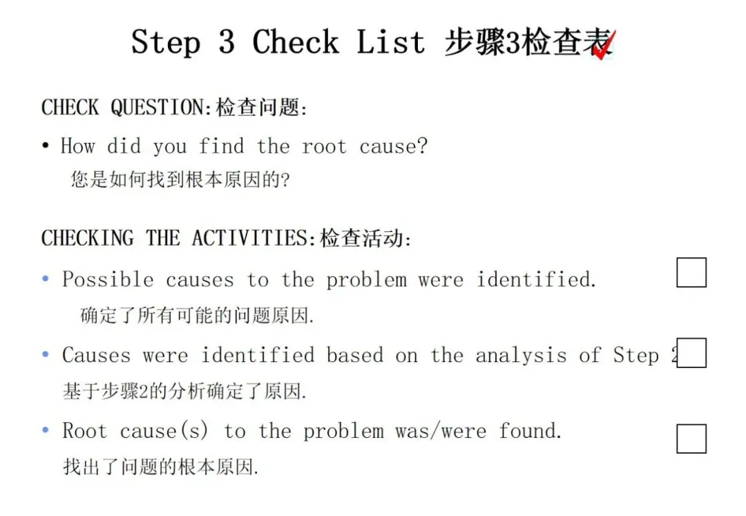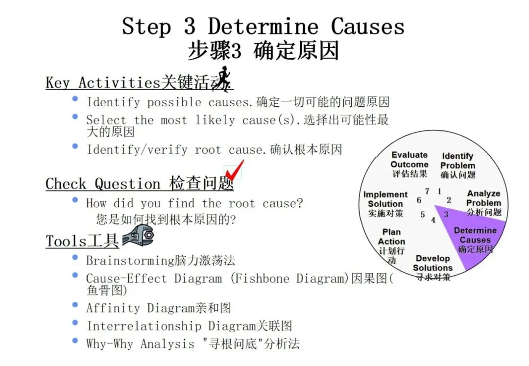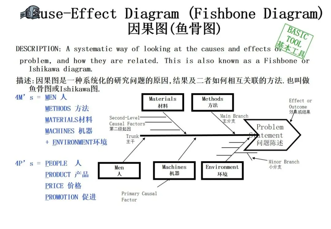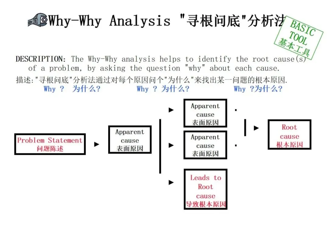 第三步,找出问题的根源,而不是只看到问题的表面。先靠头脑风暴,罗列出各种可能的原因,然后从人,机,料,法,环这五个维度,用“因果关系图”(鱼骨头图)进行梳理,又或者采用“寻根问底”的方法,对每一种原因,都要问上好几遍“为什么”,直至找出最根本的原因。