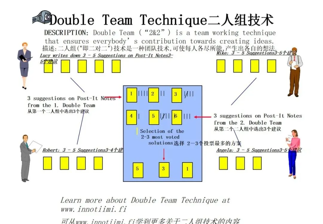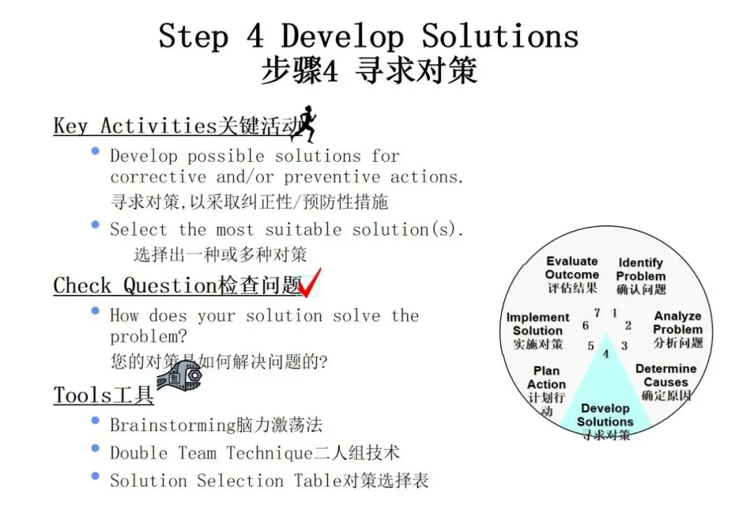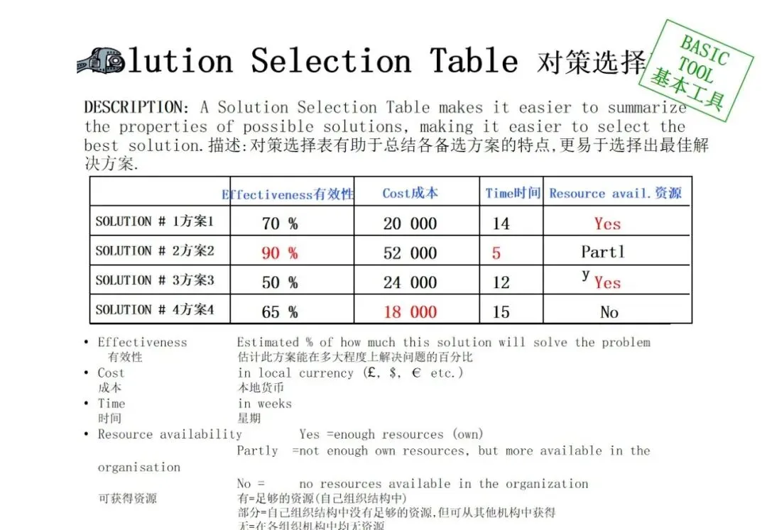 第四步,寻找对策,寻找有效的、可行的措施。先想出各种矫正和预防的方案,然后利用两人小组的技巧,让所有人都参与进来,提出自己的想法,最后根据“对策选择表”,从效率,成本,时间,资源四个方面进行评分,找出最优的方案。