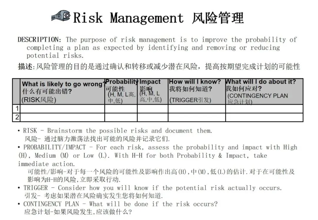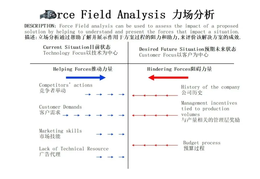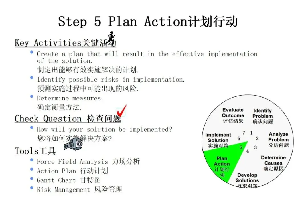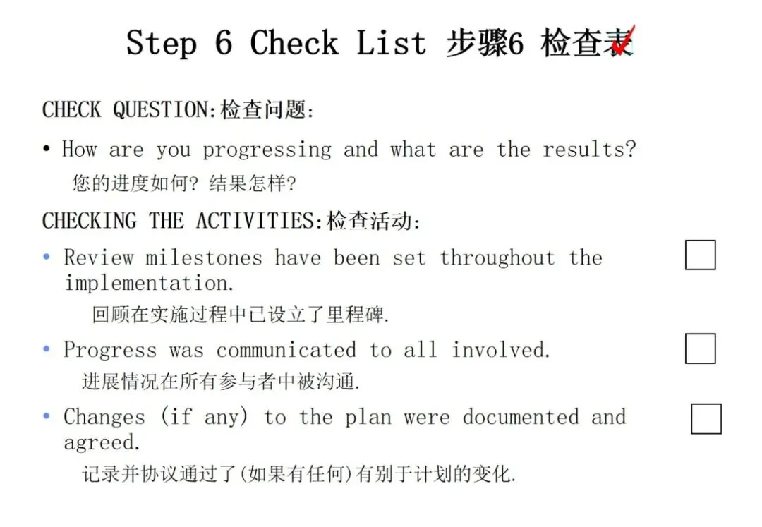 第五个步骤,规划了行动,就得落实具体的实施细节。明确谁去做,做什么,什么时候完成,并对执行过程中可能出现的风险做好预案。可以通过用力场的分析,看看推动力和阻碍力的大小,利用甘特图来规划任务的时间顺序,然后用一张简单明了的行动时间表来明确职责和时间点。