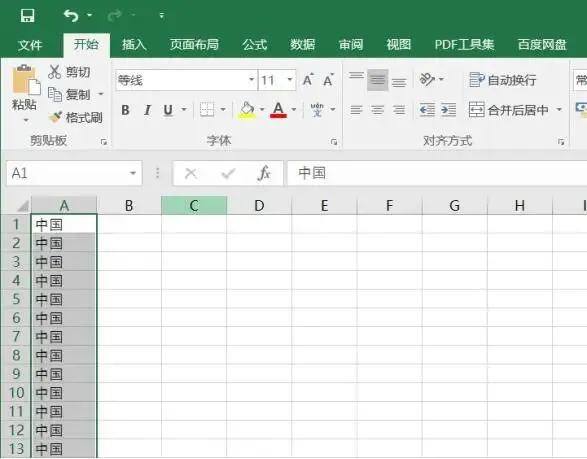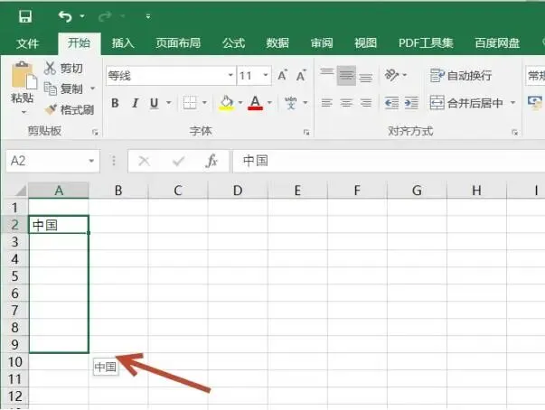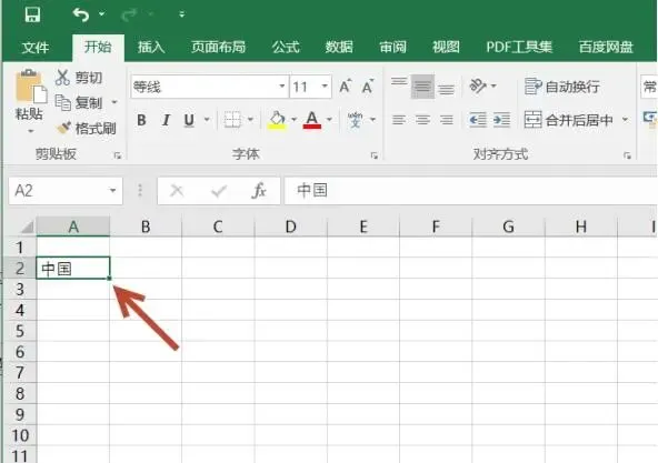 第一步:先在目标单元格输入需要重复的内容,比如“中国”等。