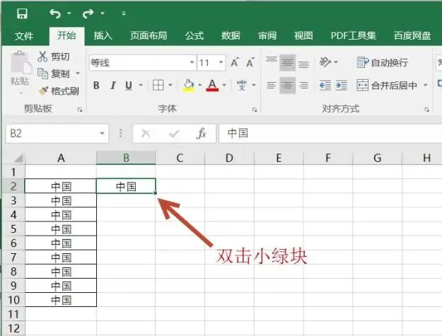 如果A列已经有现成数据,需要在B列填充相同行数的重复内容,不用逐行对齐,双击就能搞定。