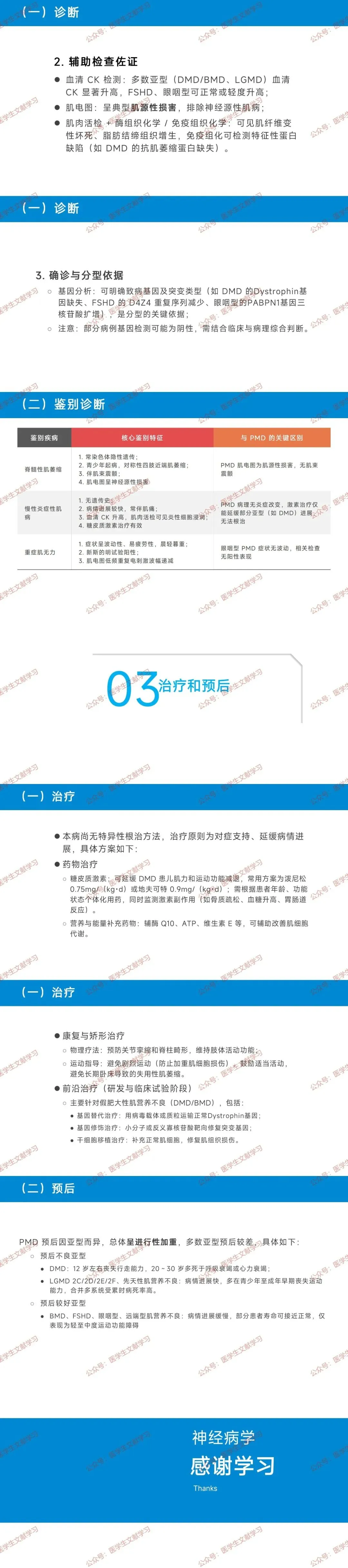 - 辅助佐证:血清 CK 检测、肌电图(肌源性损害)、肌肉活检(病理特征)。