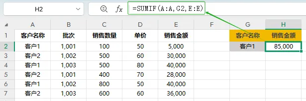 ②条件:G2,即在条件范围(A:A)列查找客户名称=G2所在行;