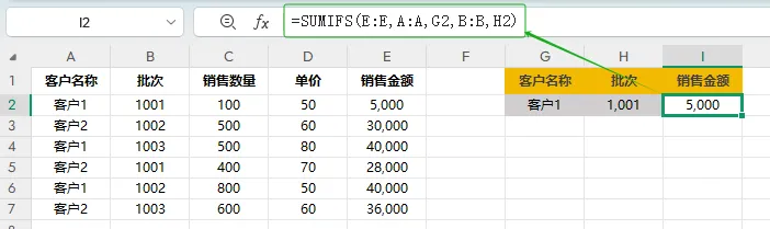 示例:计算1001批次产品销售给客户1的销售金额