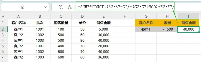 函数语法=SUMPRODUCT((条件范围1=条件1)*(条件范围2=条件2)*求和范围)SUMPRODUCT不仅有SUMIF和SUMIFS的功能,还能计算条件为一个范围时的求和,如下图:计算客户1采购数量大于等于500的销售金额合计I2=SUMPRODUCT((A2:A7=G2)*(C2:C7>500)*E2:E7)①条件范围1及条件1:(A2:A7=G2),即在A2:A7范围内查找G2(客户1)所在行;②条件范围2及条件2:(C2:C7>500),即在C2:C7范围内查找销量大于500所在行