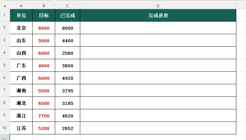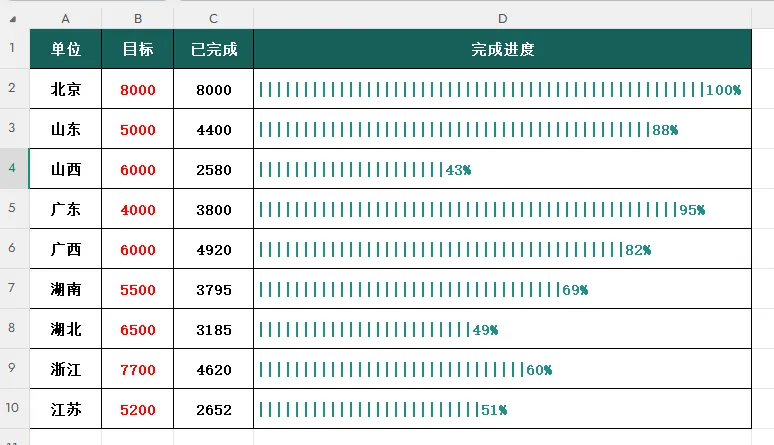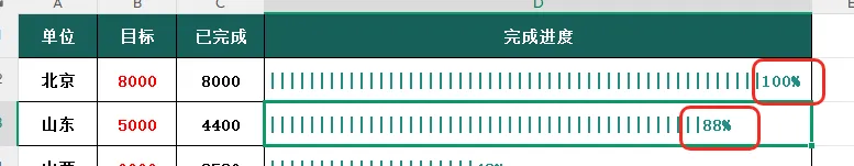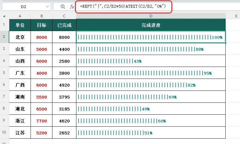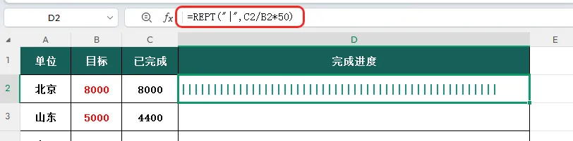 可能有学员会问:C2/B2,是完成的百分比,为什么还要*50呢?因为已完成/目标值,最大也就是1,其次是0.9、0.85……,:“1”的话,只能显示一个“|”,“0.9、0.85……”则不够1,无法显示,所以我们将值放大50倍(放大?倍,自定)。